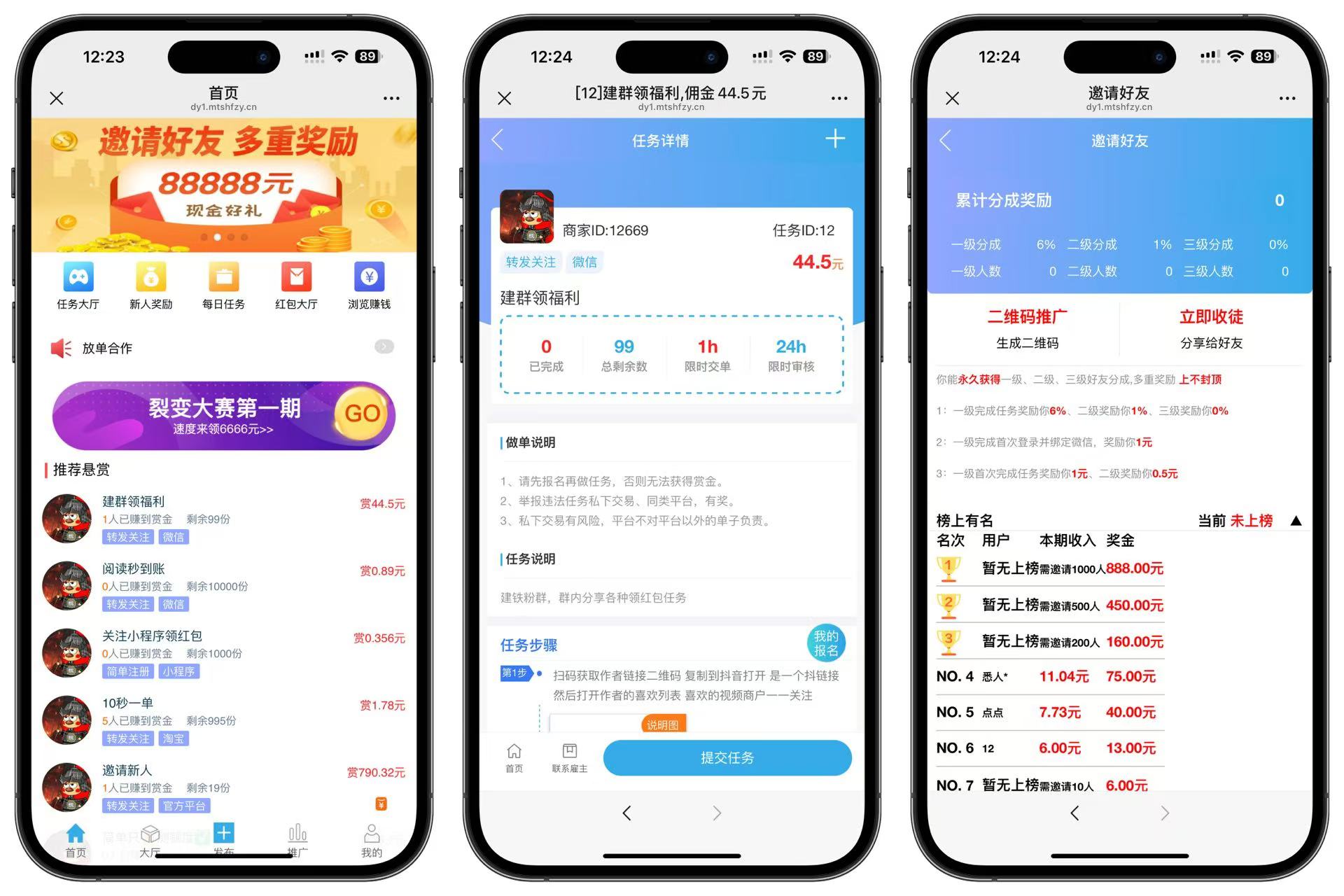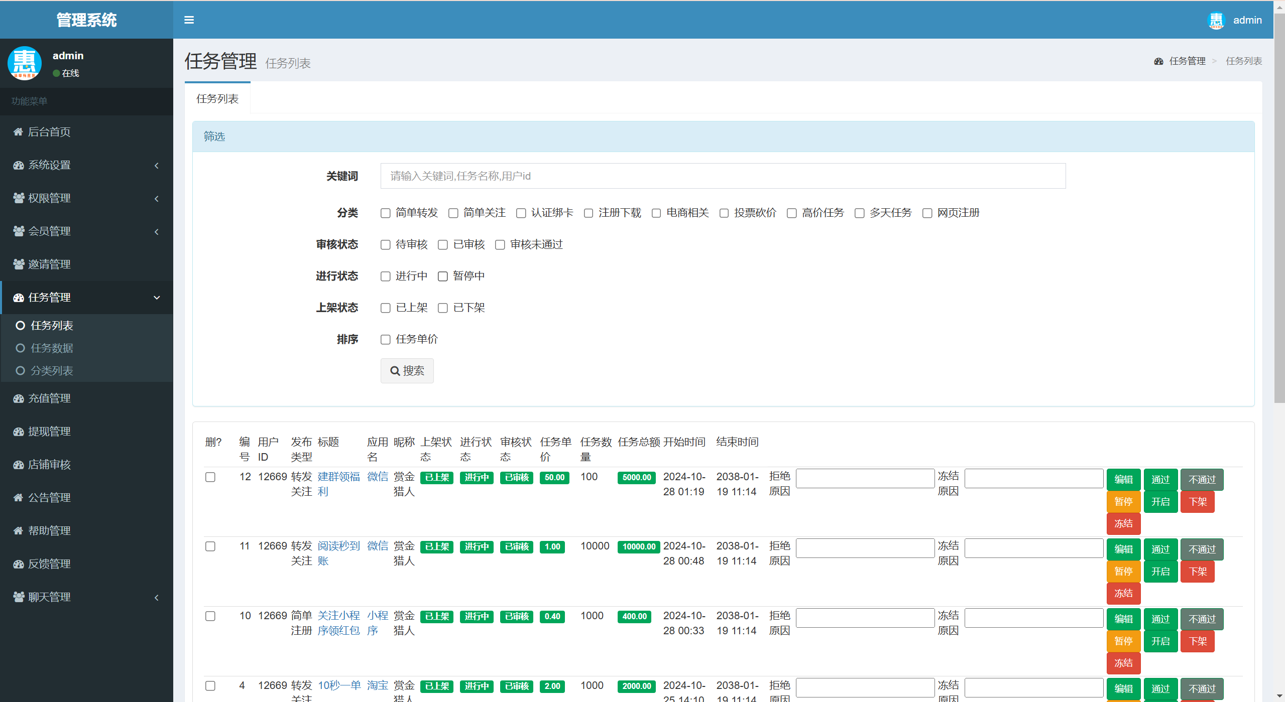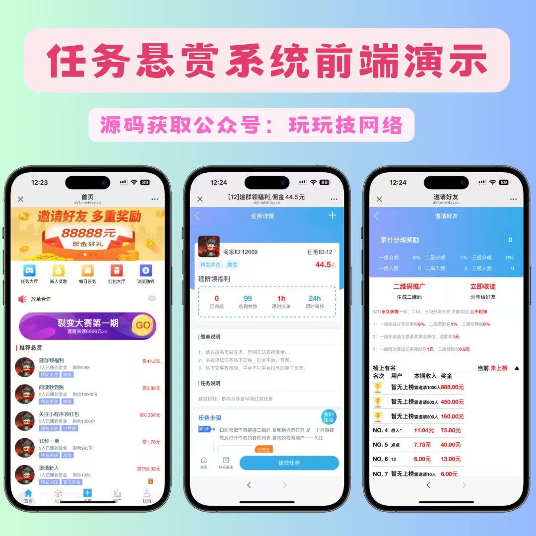 赏金赚,任务发布接单系统,目前最新最完善的一套源码,前后端全开源无加密,支持会员系统、分销推广要求好友也可以赚钱佣金,缴纳保证金提升信誉度获取对应权力,支持店铺认证,支持普通任务和线下任务,支持微信支付和支付宝支付,短信对接短信宝!详细搭建教程在源码包中!